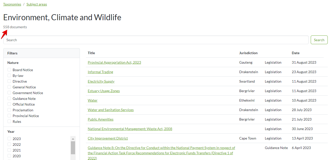 4. Clicking " [Environment, Climate and Wildlife](https://lawlibrary.org.za/taxonomy/subject-areas/subject-areas-environment-climate-and-wildlife) " subject area tag for instance returns a number of documents.