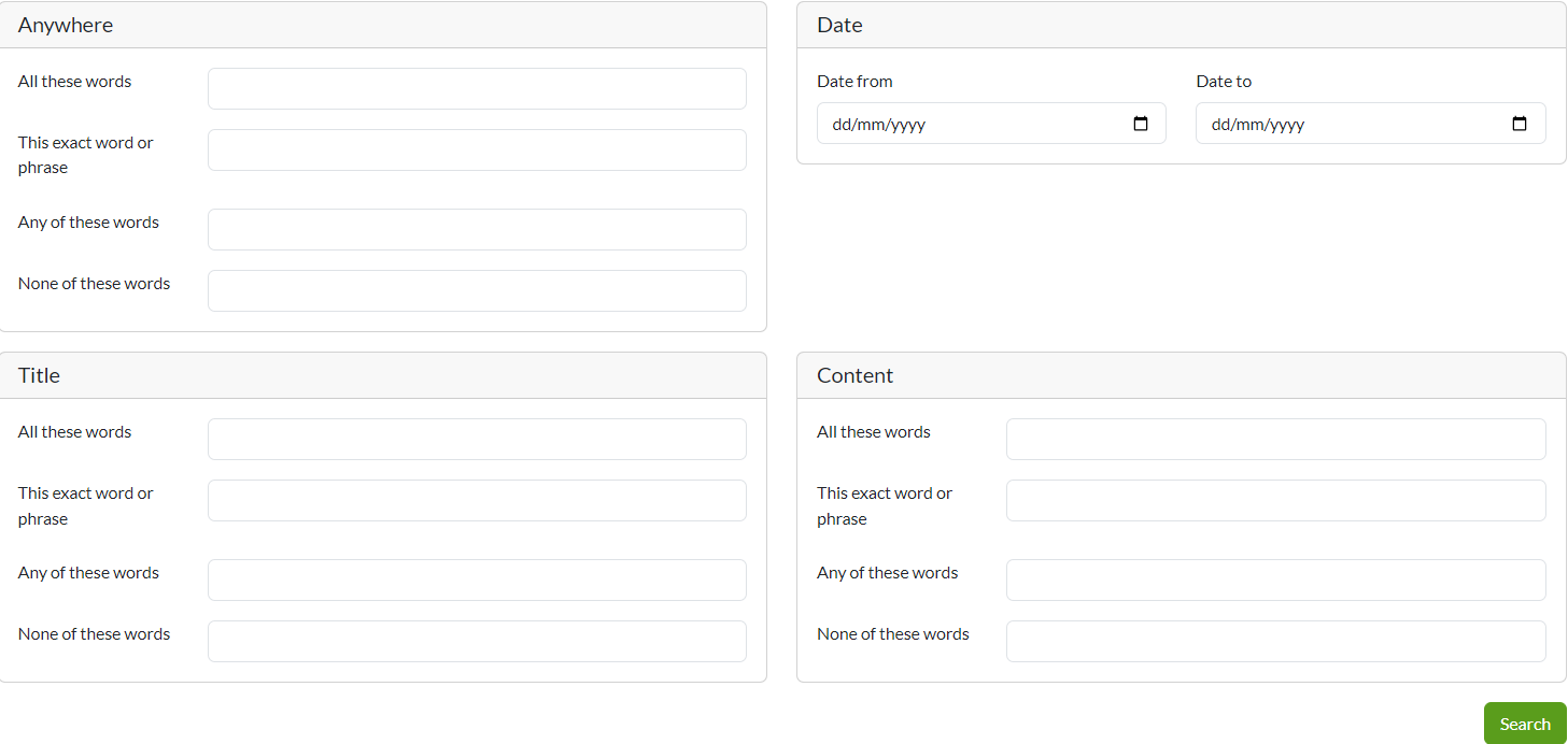 Dans la page de recherche avancée, tapez les mots que vous recherchez dans au moins un champ pour effectuer votre recherche sous n'importe où, titre et contenu.