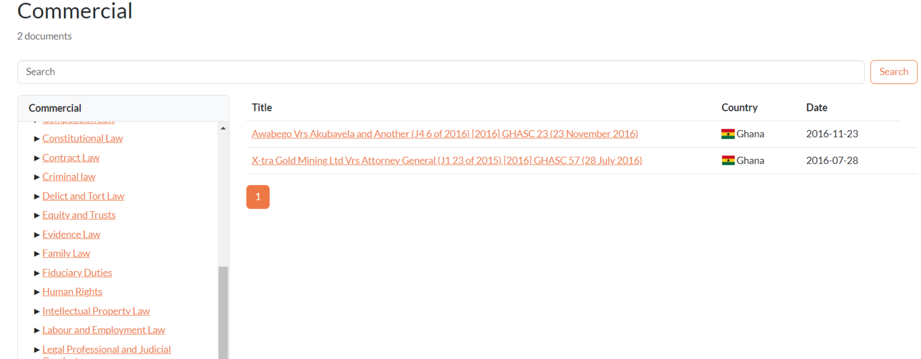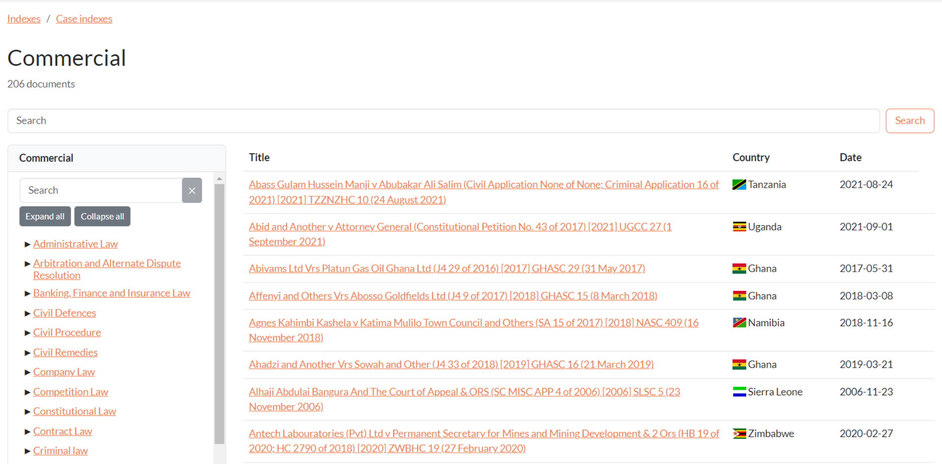 Searching for" [commercial law](https://africanlii.org/indexes/case-indexes/case-indexes-commercial) "cases for instance returns over 206 documents tagged commercial law from different jurisdictions.